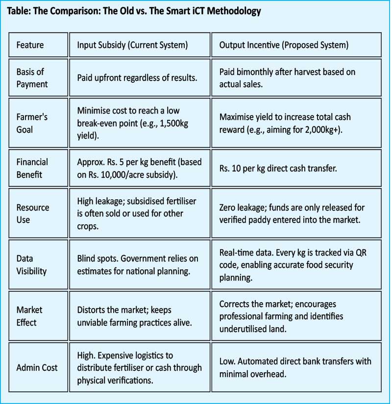 The Reward: For the Farmer: A direct cash incentive—for example, Rs. 10 per kg—is deposited into their bank account, in addition to the annually determined guaranteed price. Whereas today’s typical Rs. 10,000-per-acre fertiliser subsidy works out to roughly Rs. 5 per kg. A shift to Rs. 10 per kg in output incentives doubles the support for farmers who genuinely produce. Efficient farmers thrive. Inefficient ones are nudged—naturally—either to improve or to exit. For the Buyer: A small handling fee (e.g., Rs. 1 per kg) is paid to the government only if the digital weighing is not been used, encouraging accurate data though automated system entry and supporting field monitoring efforts.