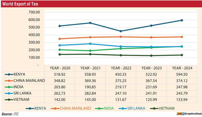 Overall, the data reflects diverse trends among major tea-producing countries. China shows consistent growth, Kenya demonstrates recovery and expansion, while Sri Lanka continues to face production challenges. These patterns highlight the varying strengths and constraints within the global tea industry.