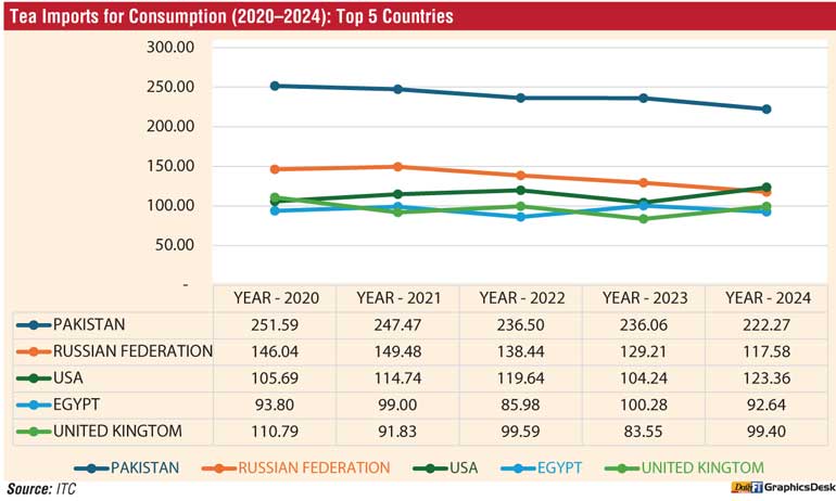 Overall, the data reflects Pakistan’s continued dominance as a tea importer, while the USA, Russian Federation, United Kingdom, and Egypt showed fluctuating trends influenced by changing demand and market conditions from 2020 to 2024