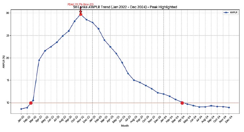 The interest rate shock came In April 2022 when the Central Bank of Sri Lanka (CBSL) increased policy interest rates by over 100% to control inflation. Consequently, the banking sector drove the Average Weighted Prime Lending Rate (AWPLR) to a historic peak of nearly 30% by December 2022. Borrowers who had obtained loans on or before April 2022 when the average AWPLR was a manageable 10% (±) were suddenly forced to pay interest rates exceeding 30%.