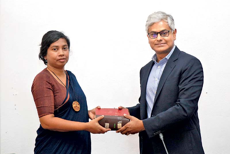 Ceylon Chamber Chairperson Krishan Balendra (right) handing over the earliest dated record to National Archives Department Director General Dr. Nadeera Rupesinghe