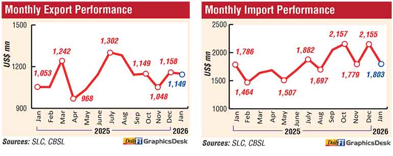 On the financial account, foreign investments in Government securities recorded a net inflow of $ 16.6 million in January 2026, while foreign investments in the Colombo Stock Exchange, including primary and secondary market transactions, recorded a net outflow of $ 21.9 million.