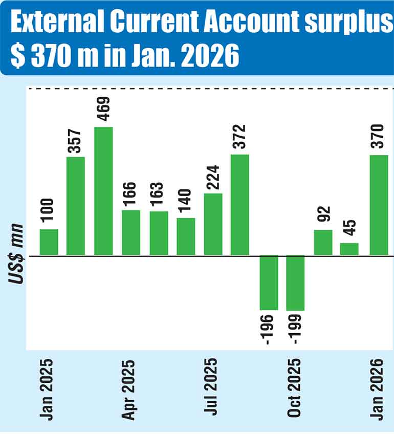 Sri Lanka’s external current account recorded a surplus of $ 369.7 million in January, more than tripling from $ 99.8 million a year earlier, as export growth outpaced imports and remittance inflows remained strong, according to the Central Bank of Sri Lanka’s (CBSL) latest External Sector Performance report.