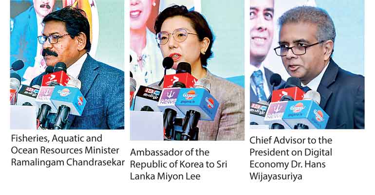 Dignitaries at the launch including; From left NARA Chairman Prof. Sanath Hettiarachchi, FAO Rome Aquaculture Specialist Dimitar Taskov, NAQDA Chairman Kithsiri Dharmapriya, Fisheries, Aquatic and Ocean Resources Ministry Secretary Dr. Kolitha Kamal Jinadasa, Ambassador of the Republic of Korea to Sri Lanka Miyon Lee, Fisheries, Aquatic and Ocean Resources Minister Ramalingam Chandrasekar, FAO Rome Senior Fishery Officer Dr. Kwang Suk Oh, Chief Advisor to the President on Digital Economy Dr. Hans Wijayasuriya, Digial Economy Ministry Advisor Sumudu Rathnayaka, Assistant FAO Representative (Program), Sri Lanka Nalin Munasinghe and Techno Crest Ventures Managing Director Sinnadurai Thayaparan