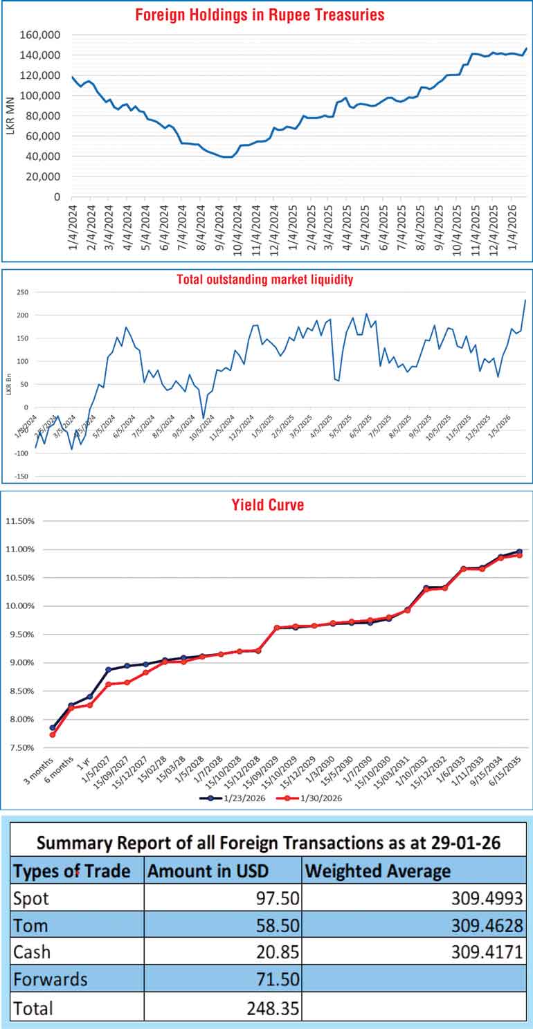 In the money market, the total outstanding liquidity surplus in the inter-bank market continued to remain elevated and stood at Rs. 233.13 billion as at the week ending 30 January 2026, increasing from Rs. 166.13 billion recorded in the previous week. Liquidity was seen surging to an over five-year high, hitting the highest figure since 8 January 2021.