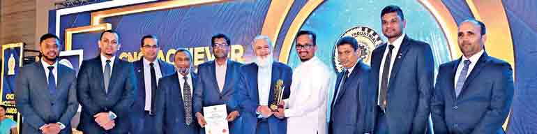 Industry and Entrepreneurship Development Minister Sunil Handunneththi (right) presenting the award to HAC Chairman Dr. Aboobacker Haroon. Others (from left): HAC Head of Banking Usama Zaid, Director/CEO Aakif A. Wahab, CNCI Chairman Pradeep Kahawalage, HAC Director M.U.M. Hussain, Managing Director Rizvi Zaheed, CNCI Awards Internal Panel of Judges Chairman Amila Sugathapala, Chairman – Steering Committee Samuditha Kumarasinghe, and HAC Head of Quality Assurance Nafas M. Nazeer
