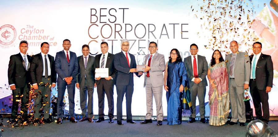 HNB Managing Director/CEO Damith Pallewatte (right) accepting the Overall Winner: Best Corporate Citizen Award from The Ceylon Chamber of Commerce Chairman Krishan Balendra. HNB Vice President – Services Roshan Fernando, Vice President – Microfinance Mahinda Senevirathne, EVP/Chief Growth Officer Bimal Perera, Chief Operating Officer Sanjay Wijemanne, SVP/Chief Strategy Officer Priyanka Wijayaratne, SVP/Board Secretary Shiromi Halloluwa; Manager – Sustainable Business Hemantha Seneviratne, and Assistant Manager – Sustainable Business Shanel Perera also also present