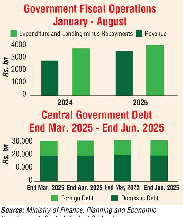 The Government continues to improve its fiscal performance with the overall Budget deficit for the first eight months of 2025 falling 54.88% from a year ago to Rs. 411 billion, according to the latest data released by the Central Bank of Sri Lanka (CBSL).