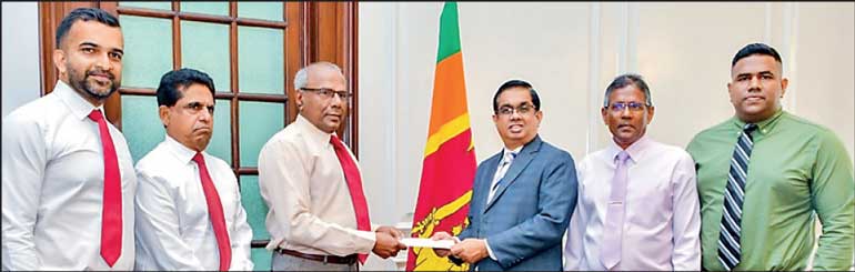 The cheque was handed over to the Secretary to the President, Dr. Nandika Sanath Kumanayake, by Naturub Group of Companies Chairman Tissa Eleperuma at the Presidential Secretariat, in the presence of the board of directors of Naturub Group.