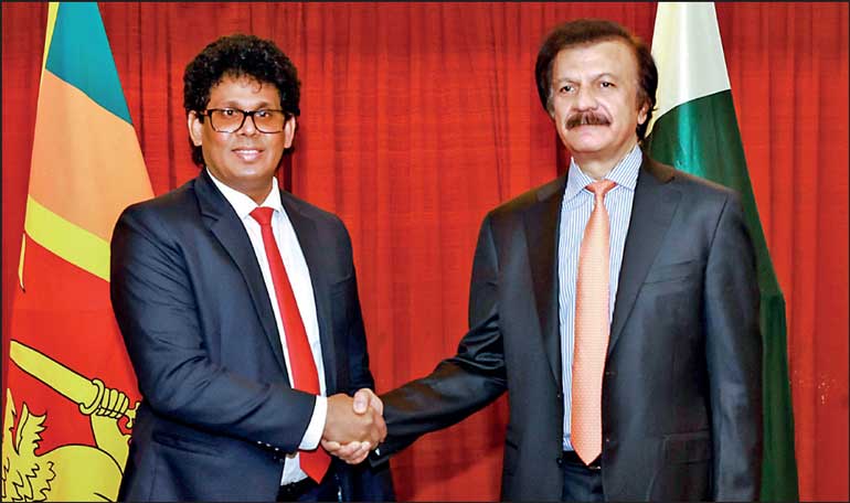 Trade Minister Wasantha Samarasinghe (left) with Pakistani Prime Minister’s Special Assistant for Industries and Production Haroon Akhtar Khan