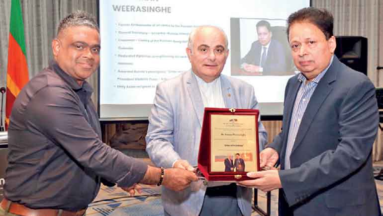 Russian Ambassador Levan S. Dzhagaryan (centre), together with SLRBC President Chamath Hettiarachchi, presenting a token of appreciation to Dr. Saman Weerasinghe in recognition of his contributions to strengthening Sri Lanka-Russia relations
