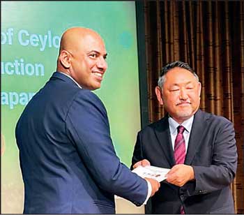 Telbedde Estate Superintendent Lakkhana Perera (left) receiving the award from Japan Tea Association Managing Director Kohei Akiba |