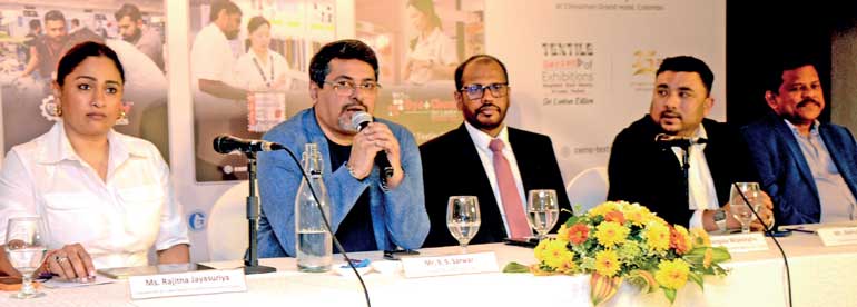 CEMS-Global (USA) Group CEO S.S. Sarwar (second from left) addressing the 15th Textile Exhibition press conference in Colombo. Others (from left): SLAEA Chairperson Rajitha Jayasuriya, EDB Chairman Mangala Wijesinghe, CEMS-Global Group Director Abhishek Das, and JAAF Chairman Felix Fernando