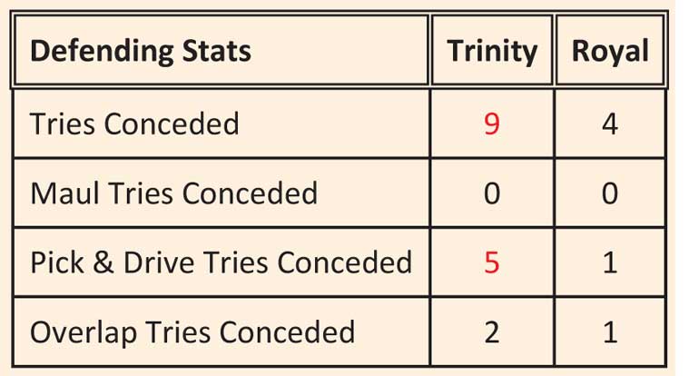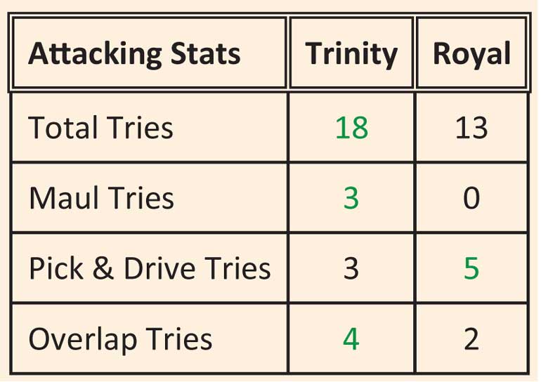 As per the above stats, Trinity has scored 50% more Tries than Royal so far, and they are quite fond of working their Mauls to score them. They are also crafty in creating overlaps using their brisk switching of the point of attack from one extreme to the other, causing disruptions in the opposition’s defence structure. Royal on the other hand has excelled in spotting slim emerging spaces, and swiftly acting upon those opportunities to bulldoze through them. The finishing of those breaks is usually directed towards the centre, and therefore the Tries are often scored either under or around the posts. If met with heavy resistance close to the Tryline, the Tuskers use their brutally ramming Pick & Drives to finish them off.