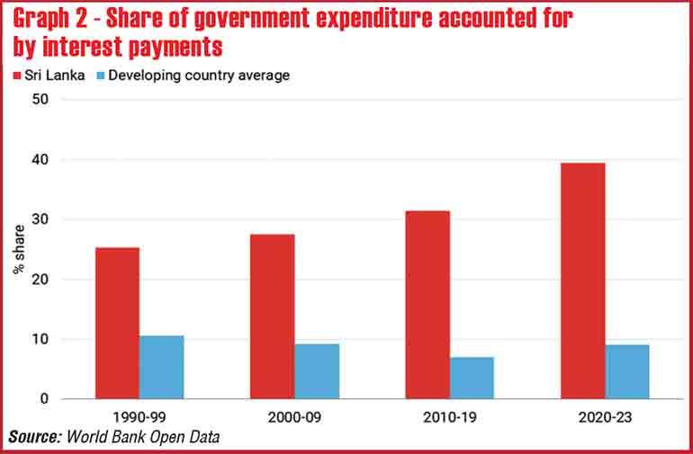 Yet here again, the proposal stops short of confronting its implications. For one thing, there is little justification offered for the magnitude of the additional spending envisaged (apart from accepting IMF estimates). More importantly, there is no clear account of how the increased expenditure will be financed.  By remaining silent on monetary and financial constraints – particularly those imposed by the new Central Bank Act – the argument implicitly accepts that expanded deficit financing will come from domestic commercial sources, compounding the Government’s already comparatively heavy local currency debt burden (see graph 2) and keeping real interest rates at high levels. Without access to concessional finance or debt relief, greater fiscal flexibility will simply lock disaster-related spending into permanently higher debt-servicing burdens, leaving Sri Lanka exposed both to volatile global markets and a costly, market-driven debt trap at home.
