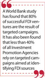A World Bank study has found that 80% of successful FDI ventures are the result of targeted campaigns. It has also been found that less than 40% of all Investment Promotion Agencies rely on targeted campaigns aimed at identifying FDI sources.