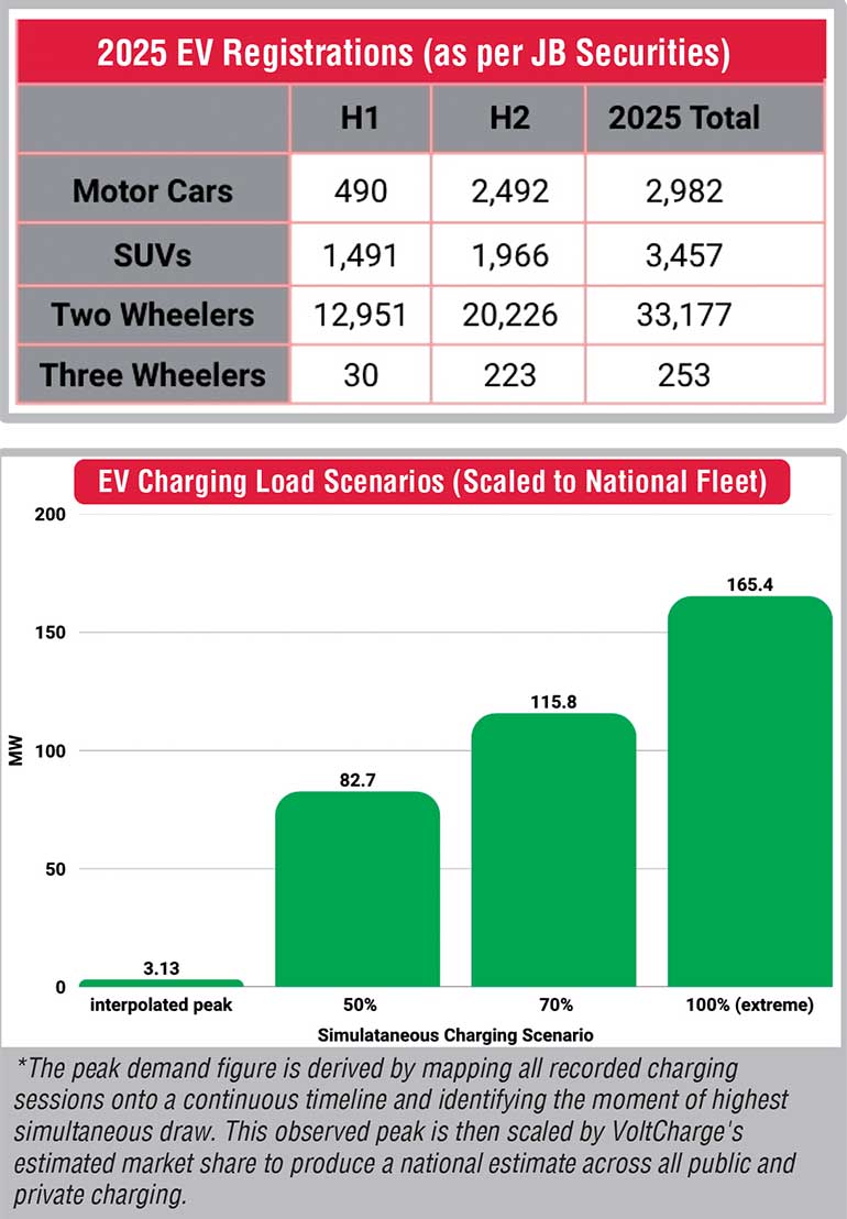 Data from Volt Charge’s networks indicates that only a portion of EV users charge at any given time, with fast charger utilisation typically ranging between 10–20%. While Volt Charge represents a growing share of Sri Lanka’s charging infrastructure, these patterns are broadly consistent with global EV usage trends. In addition, a significant share of the EV fleet consists of lower-powered vehicles, such as two- and three-wheelers, which have a considerably lower impact on overall demand.
