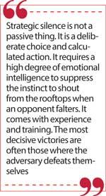Strategic silence is not a passive thing. It is a deliberate choice and calculated action. It requires a high degree of emotional intelligence to suppress the instinct to shout from the rooftops when an opponent falters. It comes with experience and training. The most decisive victories are often those where the adversary defeats themselves. In the end, watching patiently is not just about waiting for a downfall - it is about ensuring that when you finally do move, you are moving toward a goal, rather than just reacting to an argument. And that is highly likely to put you in a commanding position. It is often a strategic power play. The key is to keep your emotional intelligence reservoir and overall well-being in good shape to practice strategic silence. It is powerful but risky when misinterpreted. It may appear as indifference, avoidance, or hostility if overused or used without intention.