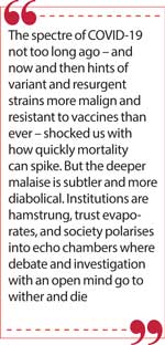 But the deeper malaise is subtler and more diabolical. Institutions are hamstrung, trust evaporates, and society polarises into echo chambers where debate and investigation with an open mind go to wither and die.
