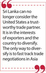 Sri Lanka can no longer consider the United States a trustworthy trade partner. It is in the interests of exporters and the country to diversify. Not that we do not sell to the US, but we cannot be dependent on that market. The only way to diversify is to fast track trade negotiations in Asia. Reduce or eliminate para tariffs on imports and make it easier to import and export.