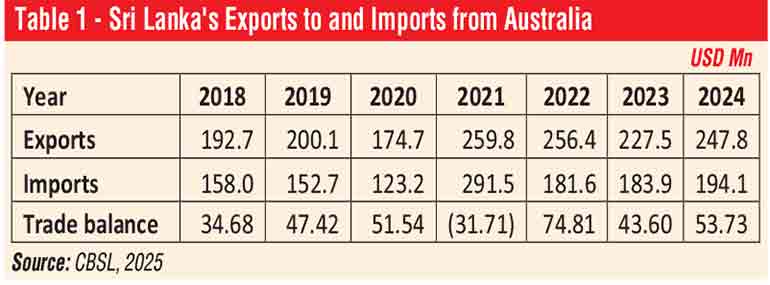 As illustrated in the Table 01, trade between Sri Lanka and Australia has continued to show positive momentum over the past in recent years. The total bilateral trade value rose from $ 350.8 million in 2018 to $ 442 million in 2024. Sri Lanka’s exports to Australia increased from $ 192 million in 2018 to $ 247 million in 2024 while imports from Australia also grew from $ 158 million in 2018 to $ 194 million in 2024.