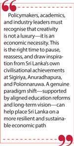 Sri Lanka’s repeated crises have created a moment for reflection. What is needed now is clear policy direction, effective implementation mechanisms, and measurable KPIs to support new growth sectors such as the creative economy. Policymakers, academics, and industry leaders must recognise that creativity is not a luxury—it is an economic necessity. This is the right time to pause, reassess, and draw inspiration from Sri Lanka’s own civilisational achievements at Sigiriya, Anuradhapura, and Polonnaruwa. A genuine paradigm shift—supported by aligned education reforms and long-term vision—can help place Sri Lanka on a more resilient and sustainable economic path.