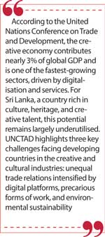 argued that “the industries of the twenty-first century will increasingly depend on creativity and innovation.” In today’s global economy, human capital—knowledge, skills, and attitudes—has become the most critical resource. This shift is reflected in global trade patterns as well. According to the United Nations Conference on Trade and Development, the creative economy contributes nearly 3% of global GDP and is one of the fastest-growing sectors, driven by digitalisation and services. For Sri Lanka, a country rich in culture, heritage, and creative talent, this potential remains largely underutilised.