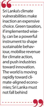 Sri Lanka stands at a critical moment in its economic and environmental journey. While efforts continue to stabilise public finances and restore investor confidence, the country faces an urgent and growing threat: climate risks that strain agriculture, water resources, coastal areas, infrastructure, and public health. The recent devastation caused by Cyclone Ditwah which brought severe flooding, landslides, and widespread displacement has made these stakes unmistakably clear. The disaster exposed vulnerabilities across critical sectors and demonstrated how climate shocks can magnify economic pressures. In this context, fiscal tools that both reduce environmental harm and finance resilience, such as green taxation, are not just desirable but essential.
