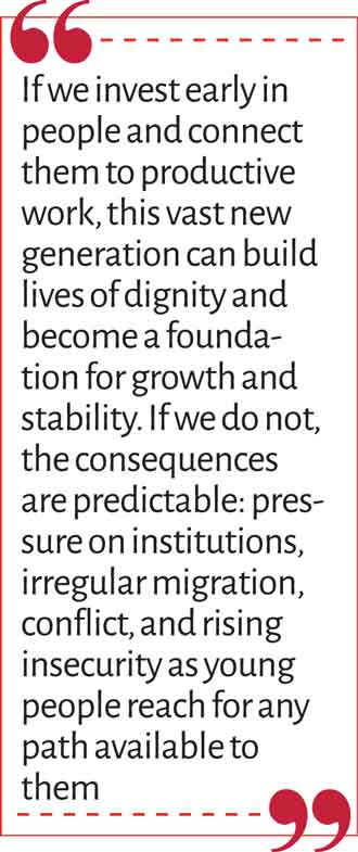 If we invest early in people and connect them to productive work, this vast new generation can build lives of dignity and become a foundation for growth and stability. If we do not, the consequences are predictable: pressure on institutions, irregular migration, conflict, and rising insecurity as young people reach for any path available to them.