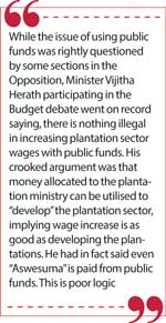 While the issue of using public funds was rightly questioned by some sections in the Opposition, Minister Vijitha Herath participating in the Budget debate went on record saying, there is nothing illegal in increasing plantation sector wages with public funds. His crooked argument was that money allocated to the plantation ministry can be utilised to “develop” the plantation sector, implying wage increase is as good as developing the plantations. He had in fact said even “Aswesuma” is paid from public funds.
