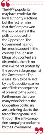 The NPP popularity may have eroded at the local authority elections but the fact remains that the Compass won the bulk of seats at the polls as opposed to the Opposition. The Government has not lost much support in the country. Though rumblings of discontent are discernible, there is no massive roar of protest by the people at large against the Government.