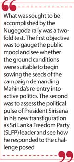What was sought to be accomplished by the Nugegoda rally was a two-fold test. The first objective was to gauge the public mood and see whether the ground conditions were suitable to begin sowing the seeds of the campaign demanding Mahinda’s re-entry into active politics. The second was to assess the political pulse of President Sirisena in his new transfiguration as Sri Lanka Freedom Party (SLFP) leader and see how he responded to the challenge posed.