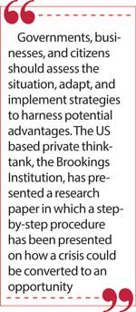 For this purpose, governments, businesses, and citizens should assess the situation, adapt, and implement strategies to harness potential advantages. The US based private thinktank, the Brookings Institution, has presented a research paper in which step by step procedure has been presented how a crisis could be converted to an opportunity [7].