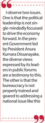 In this context, I observe two issues. One is that the political leadership is not single-mindedly focussed to drive the economy forward. In the present Government led by President Anura Kumara Dissanayake, the diverse views expressed by its leaders in public forums are a testimony to this. The other is that the bureaucracy is not properly trained and geared to addressing a national issue like this. I have written about how different Government agencies have thwarted a genuine attempt by an Indian investor to setup a mini hydroelectricity project in Ginigathhena though moving into sustainable energy has been a declared goal of the Government [9].