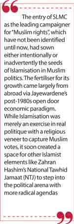 Be that as it may, the entry of SLMC as the leading campaigner for “Muslim rights”, which have not been identified until now, had sown either intentionally or inadvertently the seeds of Islamisation in Muslim politics. The fertiliser for its growth came largely from abroad via Jayewardene’s post-1980s open door economic paradigm. While Islamisation was merely an exercise in real politique with a religious veneer to capture Muslim votes, it soon created a space for other Islamist elements like Zahran Hashim’s National Tawhid Jamaat (NTJ) to step into the political arena with more radical agendas.