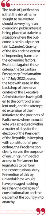 Evaluated against these criteria, the Sri Lankan Emergency Proclamation of 17 July 2022 passes the test with ease. In the backdrop of the nerve centres of the Executive Administration having fallen to the control of a violent mob, and the attempted extension of their initiative to the precincts of Parliament, where a crucial vote was scheduled within a matter of days for the election of the President of the Republic, in keeping with constitutional procedure, the Proclamation clearly served the purpose of ensuring unimpeded access to Parliament for legislators to perform their constitutional duty. Prevention of this by unlawful force would have presaged nothing less than the collapse of constitutionalism and the descent of the country into anarchy.