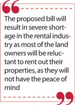 at a time when the prevailing interest rates are down, people inclusive of Senior citizens, venture into various other options such as the real estate market by investing their hard earned money towards deriving additional income; this is the current reality. Effective mechanism towards strengthening the rights of the property owners is an important priority in ensuring the rental market is not affected. Weakening their rights will not only discourage them in renting out their properties, it will also restrict the people in venturing into the real estate market. The proposed bill will result in severe shortage in the rental industry as most of the land owners will be reluctant to rent out their properties, as they will not have the peace of mind.