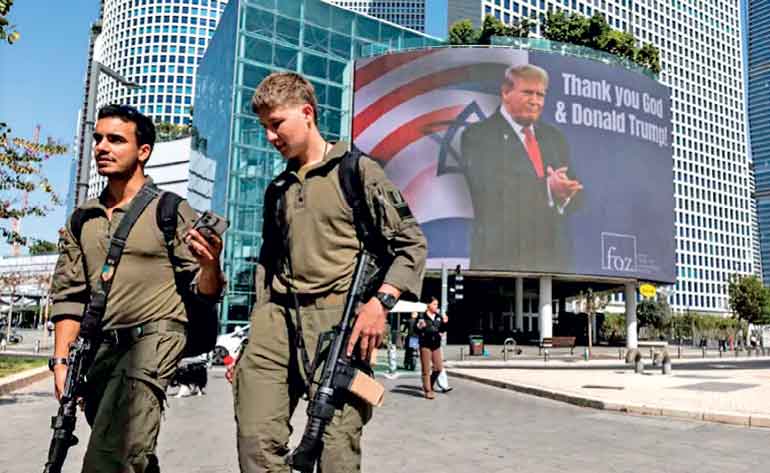 Israeli soldiers walk by a billboard commissioned by the evangelical Christian group Friends of Zion during the US-Israel war on Iran in Tel Aviv, Israel