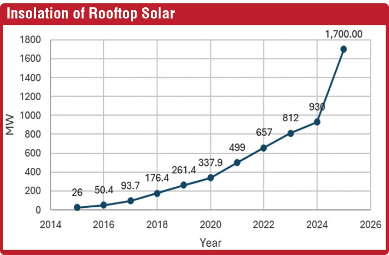 The rooftop solar capacity has increased rapidly, particularly from 2024 (930 MW) to mid-2025 (1,700 MW); this is an increase of 82% compared to 2024. This rapid increase takes place within a period where the country is recovering from an economic downturn. There are three market segments: industrial rooftop, commercial rooftop, and residential rooftop. Out of three market segments, the residential segment is leading, which is about 50% of the total installation capacity, while the commercial segment is the smallest, which would be around 14%. There is a growing interest in investing in rooftop solar among the general public as their second income source. Given the low interest rates for deposits, the public could see that investing in rooftop solar is a much better option than keeping money in the bank.