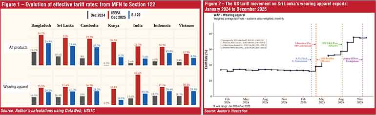 The Section 122 tariff regime is less harmful to Sri Lanka for three reasons. Firstly, due to the reduction in tariff rates from higher levels under IEEPA (Figure 1). Secondly, it also reduces the tariff gap between Sri Lanka and countries with favourable tariff arrangements under the IEEPA regime. The tariff differential between countries like Kenya goes down. For example, the effective tariff rate for wearing apparel exported by Kenya was about 10% under the IEEPA and AGOA tariff regime, while Sri Lanka faced a 37% rate, creating a 27% tariff gap between the two countries. However, under Section 122, the differential will be about 17%. A similar differential reduction occurs against Canada and Mexico, which are part of the United States-Mexico-Canada (USMCA) free trade agreement. When other countries faced higher reciprocal tariffs, the USMCA preferential premium for Canada and Mexico was higher. The USMCA premium reduction may help countries like Sri Lanka, which export rubber products.