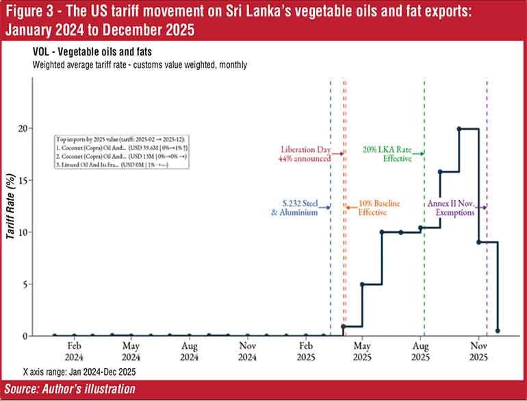 The tariff rise was not uniform due to exemptions and section tariffs, such as those on steel and aluminium. In November 2026, the US expanded these exemptions to include agricultural products. The notable beneficiary of this exception was Sri Lanka’s coconut oil exports (Figure 3). The effective tariff rate plummeted to the MFN level in November, resulting in a close-to-zero rate. In contrast, steel- and aluminium-related products saw a tariff increase of nearly 40 percentage points due to the Section 232 tariff, which was set at 50%.
