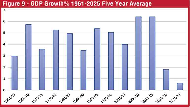 The five-year moving average of the GDP growth from 1966-1970 to 2001-2005 displayed a declining trend. After having recorded an exceptionally high average growth of 6.4% for the periods of 2006-2010 and 2011-2015, a sharp decline of the five-year average GDP growth (impacted mostly by the economic crisis in 2022) was recorded for the period from 2016-2020 to 2021-2025 (see Figure 9). If the Government remains with a business as usual approach to sustain the existing low-growth, low-productive traditional sectors, falling into a low growth trap is unavoidable.