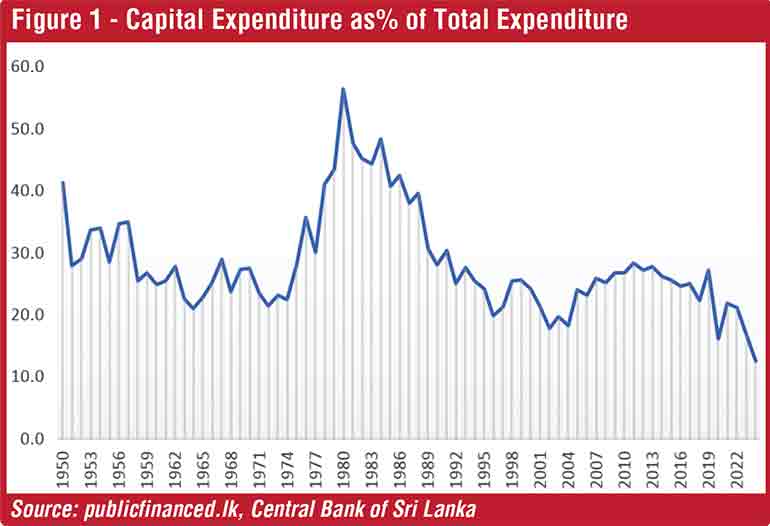 Capital expenditure of the State since 1950 gradually declined from 41.3 % of the total expenditure to 21.6% in 1972 and suddenly elevated to the historic highest level of 56.6% in 1980. This was due to heavy investments in large construction projects like the Mahaweli Multi-Purpose Development Projects with the opening up of the economy under market liberalisation policies in the late 1970s. Ever since, capital expenditure of the State drastically declined to 12.7% in 2024, the lowest since Independence. By contrast, high levels of welfare spending have contributed to progressively enlarge the size of budget deficits, draining scarce resources away from investment to consumption (see Figure1). Ever-growing recurrent expenditure on the other hand consumed more than 85% of State revenues by 2024.