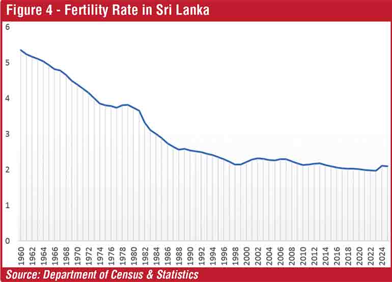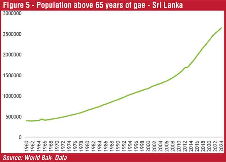Sri Lanka is going through a rather unique demographic transition compelling the State to provide for more spending. The fertility rate in Sri Lanka has been falling significantly from 5,35 births per woman in 1960 to 1.97 births per woman in 2023. It is projected to be 2.1 births per woman in 2025 (see Figure 4). According to the current projections of the United Nations, global fertility will reach the replacement level of 2.1 births per woman by 2050. Sri Lanka has already reached this replacement level by now, a quarter century earlier than the projections. This means that no more children will be added to replace this generation with the next generation. Moreover, a shrinking of the active labour force will be an obstacle to productivity growth and economic expansion beyond 2025. While the population growth rate dropped to below zero level by 2024, the population aged 65 and above grew from 408,060 in 1960 to 620,543 in 2000 and then surged to 2,652,699 in 2024 (see Figure 5). This is the highest proportion of older adults in South Asia. By 2030, all baby boomers (born 1946-1964) will be aged 65 or older with a significant demographic shift causing a wide range of implications. This large segment of the adult population, projected to be 3,300,000 or 14,7% of the total population by 2030, will be a challenge to manage public spending with pressure not only on healthcare and the social system but also on the economy and budgetary management.