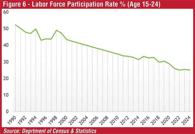 Apart from the declining population in the country, the economically active labour force will continue to shrink. The labour force participation rate declined significantly from 52.5% in 1990 to 25.3% in 2024(see Figure 6). This trend shows that the shrinking labour force will lead to slowing down revenue generation. Future potential for revenue growth is constrained by lower productivity, lower tax, lower national income, lower growth and lower savings. Predicting Generation-Z’s behavior is challenging for business due to their higher mobility, lower brand loyalty and decision-making by a mix of market, economy and social factors. Other factors contributing to a shrinking workforce include rising labour market inactivity, particularly among youth, and a decrease in overall employment growth. Rapidly expanding retired workers on the other hand create a higher cost burden to the State as the public sector pension payments will increase significantly and persist as an obstacle to reducing fiscal deficit and recurrent expenditure. As a result of improved life expectancy of senior citizens in the country due to free public health services, the oldest segment of people will increase with a high demand for elderly care and medical treatments. It was estimated that public expenditure on pension payments and social assistance is approximately three percent of GDP or more than 12% of Government revenue in 2024. This can be doubled by 2030 with the entire baby boomer employees retiring from the public service.