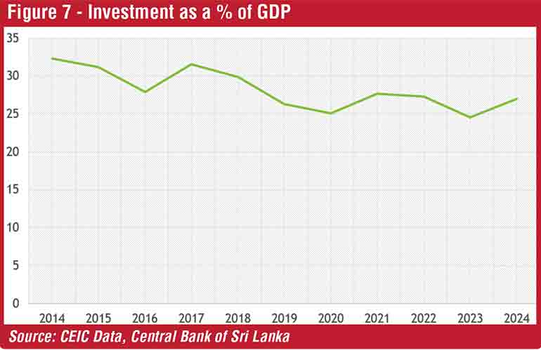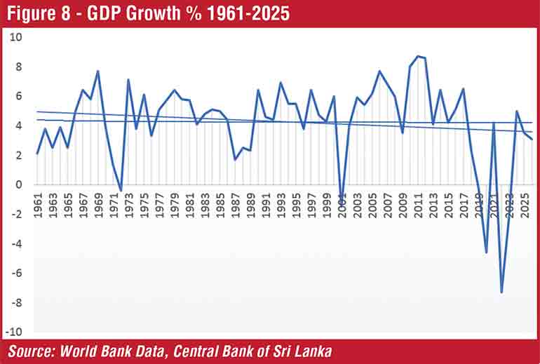 Given the declining capacity of the State with constantly rising public debt, rising recurrent expenditure and the limitations to rely on taxing people, the only option available to drive an economic growth trajectory is productivity growth. Although the urgency of productivity enhancement is widely recognised at development forums and economic discussions, turning those ideas or political commitments into action never took place due to capital scarcity stemming from the economic slowdown. Investments throughout the last decade gradually declined from 32.3% of GDP in 2014 to 27% in 2024 (see Figure 7). Therefore, significantly high-scale investment, both local and foreign depends very much on enhancing productivity (to be beyond 30% of GDP), entrepreneurship building with innovations and modern technological transformation (to sustain more than 6% GDP growth). However, the historic pattern of GDP growth in Sri Lanka shows a downward trend with deeper fluctuations to the extreme lowest negative growth of -7.3% in 2022 with the economic crisis. The average GDP growth is around 4-4.5% for the last 40 years of the 20th century and the first quarter of the 21st century (see Figure 8).