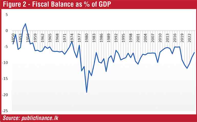 This trend of capital erosion contributed not only to weaking the revenue generating capacity of the State but to also growing the fiscal deficit constantly during the entire second half of the 20th century (1950-2000) and the first quarter of the 21st century up to 2024. Except in the year 1955, which recorded a surplus fiscal balance due mainly to the sudden rise of tea prices in the export market (tea boom), in all years from 1950 up to 2024, Sri Lanka’s fiscal balance remained constantly negative. On average it has been 10% of GDP throughout the non-conventional modern era (2001-2024) of the 21st century. Exceptionally high fiscal deficits have been recorded after entering into an open/liberalised market economy in the late 1970s and during the post-pandemic economic crisis in 2021/22 (see Figure 2). Irrespective of those contrasting situations the fiscal deficit continued to rise significantly. The State as the key administrative mechanism overall is in decline as the political authorities have not been able to move its functional activities away from their politically pledged welfare-oriented consumer spending agendas to investment.
