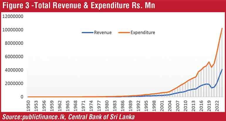 Moving forward with those challenges, the Government is facing a difficult task of accelerating accumulation functions of the State to ensure revenue growth is higher than the growth of expenditure. However, from the beginning of the 21st century, Sri Lanka Government spending grew continuously much faster than revenue growth. In 2000, total revenue was Rs 216,427 million while expenditure grew much faster to Rs 335,823 million, which is Rs 146,722 million more than the revenue. At the end of 2024, total revenue increased to Rs 4,090,808 million while expenditure climbed far beyond up to Rs 6,130,739 million, which is Rs 2,039,931 million more than the total revenue (see Figure 3). The gap between revenue and expenditure of the State continues to grow much wider. In this respect, a radical structural change is needed not only for highly efficient management of State institutions and resources with good governance but also for creating a very impressive investment climate to attract foreign investment necessary to boost economic growth.