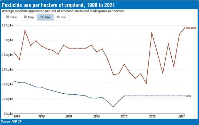 Source: World Bank data The same pattern holds for pesticides. Sri Lanka uses 1.08kg/acre compared to India’s 0.24kg/acre, which is well over four times (see graph below). This environmentally and biologically hazardous level of chemicals application likely contributes to the high prevalence of Chronic Kidney Disease of Unknown Etiology (CKDu) among Sri Lankan farmers, while per hectare yield of cereals and paddy remains low compared to India’s approximately six to seven tons per hectare in some high yielding paddy lands. It is important to note that aggregate data for cereal yields may not fully reflect India’s higher paddy yields due to the aggregation effect with other, low-yielding grains. In spite of the low fertiliser use in India the incidence of CKDu among farmers has been on the rise recently while remaining below Sri Lanka’s percentage. The significant increase in the application of fertiliser since 2000 could potentially explain this trend. Source: FAO UN