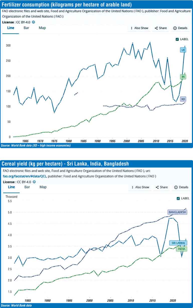 Hazardous application of agrochemicals hand in hand with lower yields escalate unit production cost and the cost of food of the domestic workforce in the absence of cheaper food imports from the region. Sri Lanka in this context needs to release at least 20% of its paddy land (around 350,000 acres) -specifically the low-yielding, flood-prone areas encroached upon in recent decades- without a serious drop in output and transition the workforce into higher-quality non-agrarian employment.